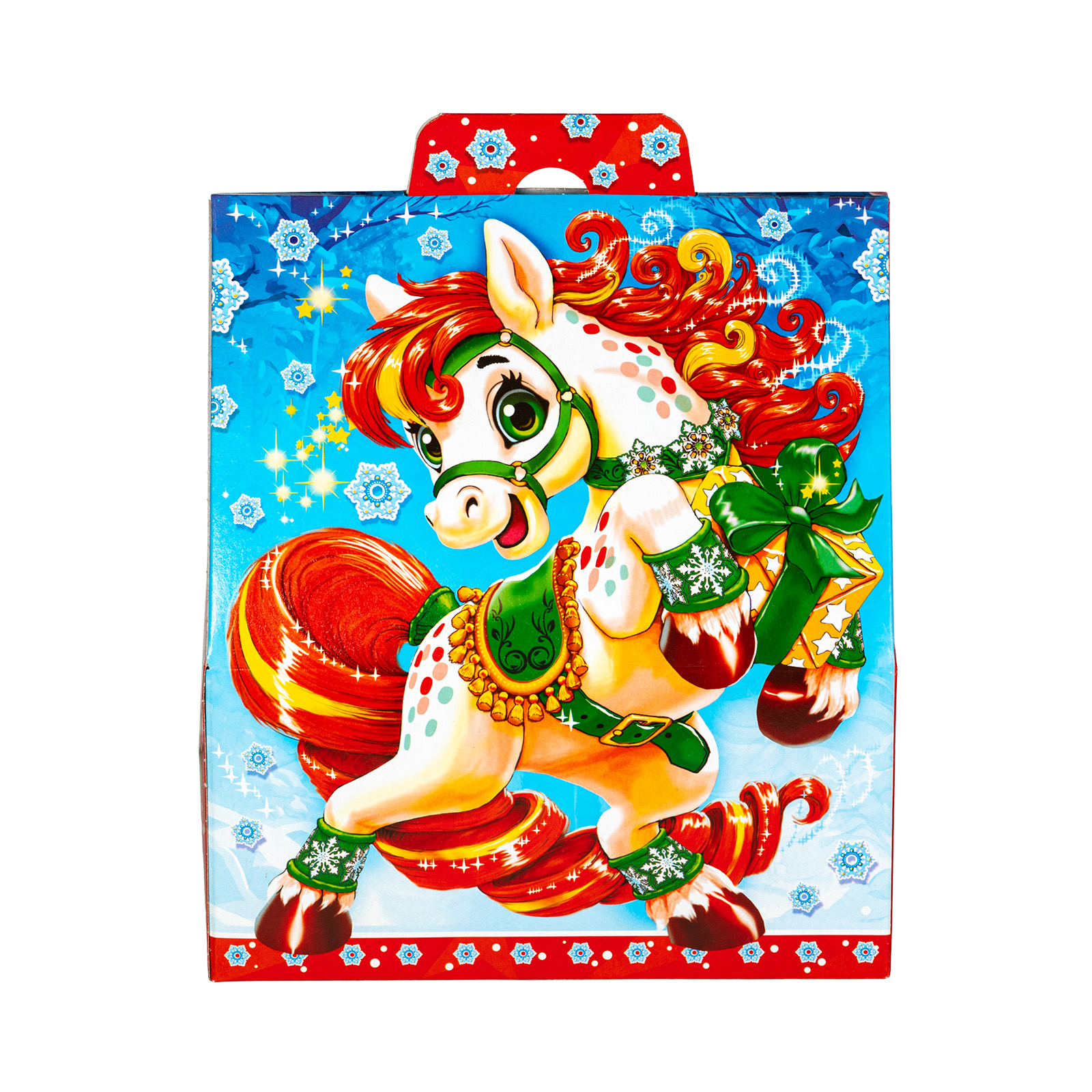Новогодний сладкий подарок с изображением символа наступающего года - это беспроигрышный вариант под любое праздничное торжество. “Астра” -. это небольшая картонная коробочка с изображением веселой грациозной лошадки. Сверху имеется удобная прорезная ручка, а внутри этой коробки бережно хранятся вкусные и разнообразные сладости. Помимо угощений данный набор содержит небольшой памятный сувенир, а также сбоку есть мини-игра на внимательность и логику. Этот конфетный набор за счет компактных размеров и невысокой стоимости прекрасно подойдет для покупки в школы или детские сады - детки будут в восторге!