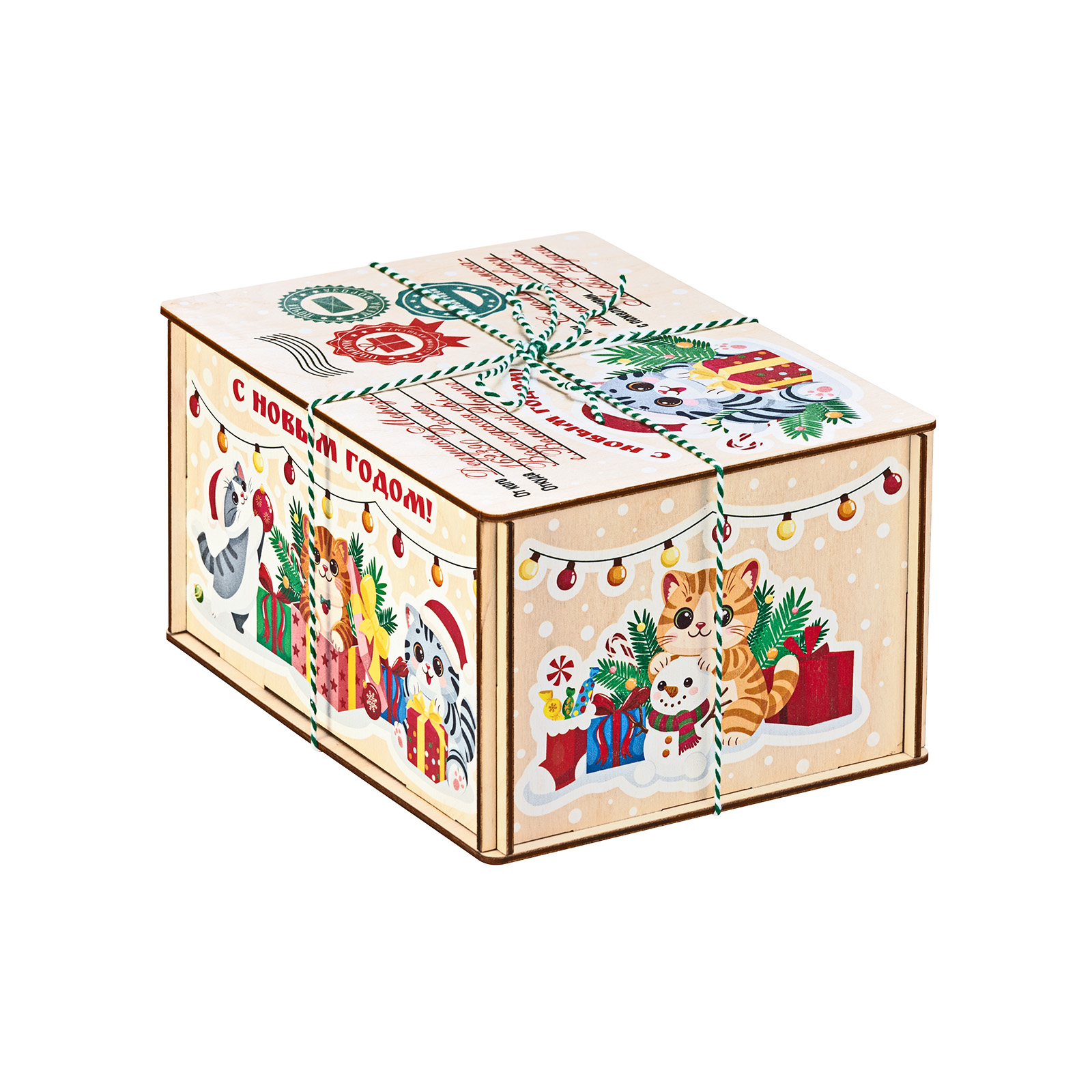 Новогодний сладкий подарок в деревянной упаковке - это сочетание практичности и оригинальности. За счет таких качеств подобные наборы подходят для дарения сластенам любого возраста. “Котики” - небольшой деревянный ящичек, оформленный под самую настоящую почтовую бандероль. Со всех сторон ящик украшен праздничными рисунками с милыми котятами, которые уже во всю готовятся отмечать Новый год. Но самое главное находится внутри - там бережно хранятся самые разнообразные лакомства для новогоднего стола. Здесь каждый сможет найти себе угощение по вкусу!