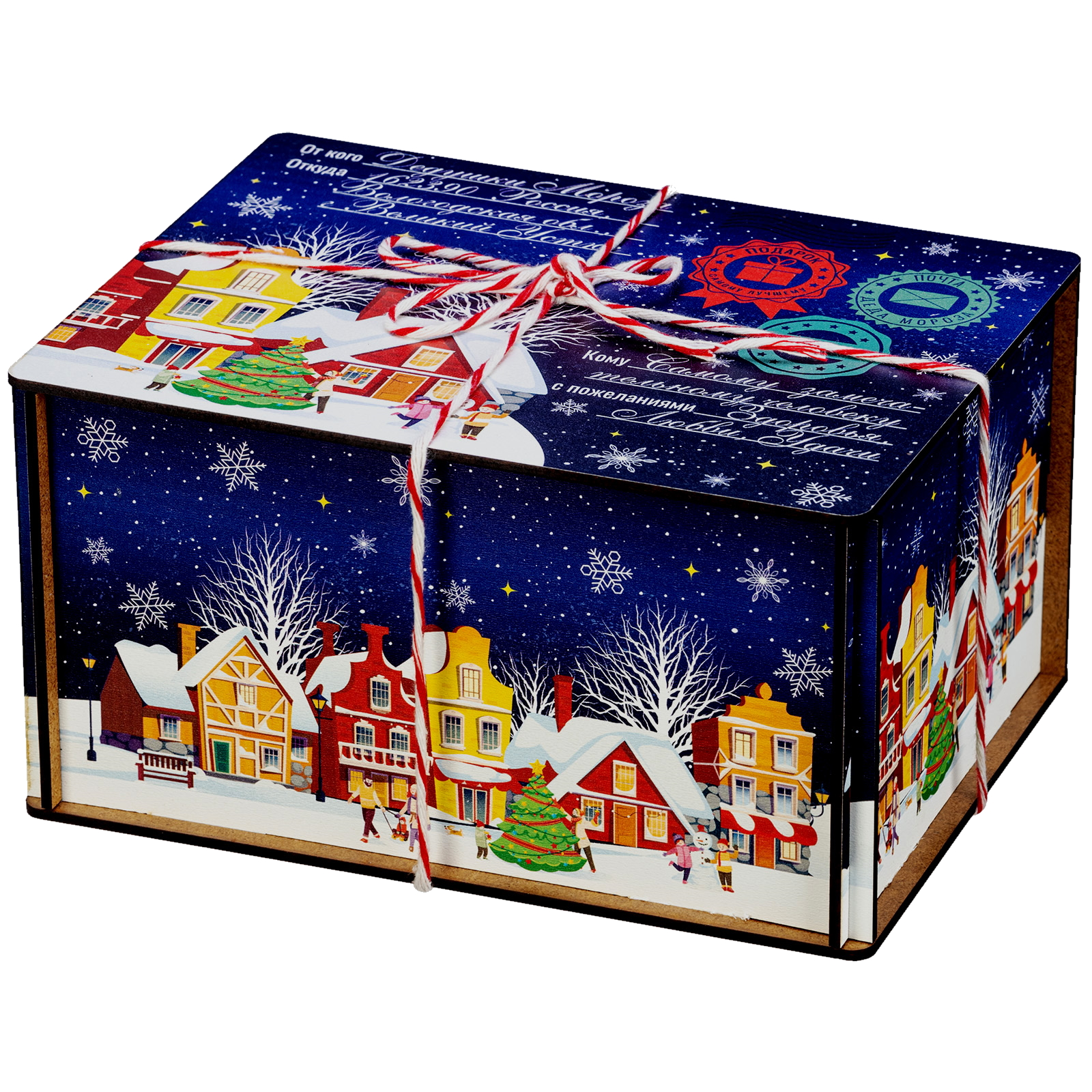 “Синяя ночь” - это новогодний сладкий подарок, который идеально в себе сочетает неповторимый вкус любимых сладостей и креативную оригинальную упаковку. Сладости бережно спрятаны в небольшой деревянный ящичек, украшенный со всех сторон разнообразными праздничными иллюстрациями в виде небольшого зимнего городка. Сверху упаковка закрыта удобной крышкой, оформленной в стиле посылки - посмотрите, даже фирменные печати есть! Внутри этого подарка находится килограмм разнообразных отборных сладостей и небольшой памятный сувенир. Такой подарочный набор универсален - его с легкостью можно вручить как взрослому, так и ребенку - восторг гарантирован в любом случае!